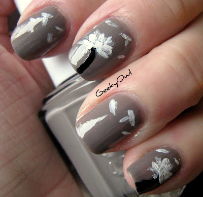 I used Essie Chinchilly as the primary nail color. It's a gray taupe with what I would say a tinge of purple. But when I read about it around the internet, people are saying it is a tinge green. Green? Not mine. But look at Scrangie's Chinchilly. Her's definitely has green in it. I wonder if they have changed the color formula? I have no idea. But I still love this one that I have. This is two coats and when on wonderfully. I used Sally Hansen Black Out for my stems and Color Club French Tip for the dandelion seeds.